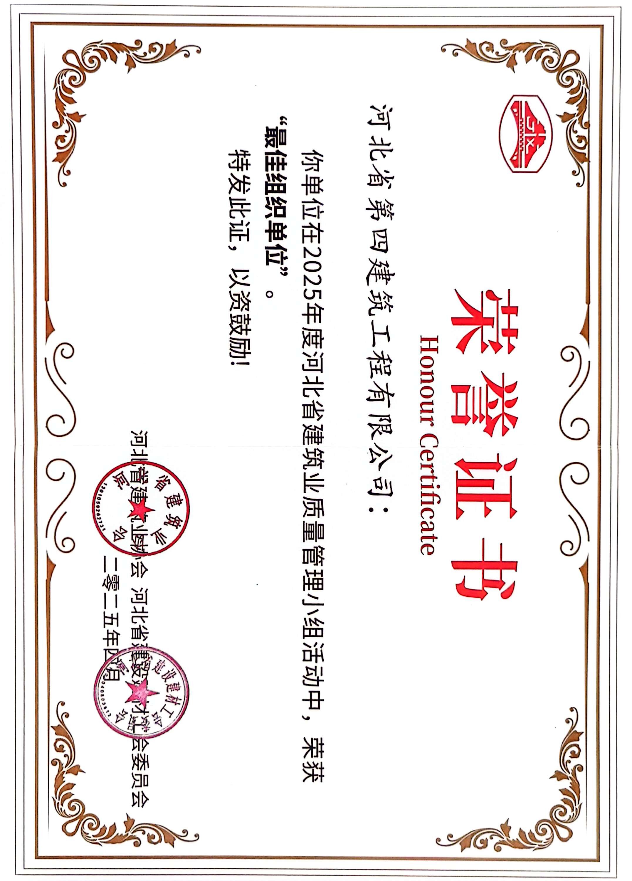 河北四建:2025年河北省质量管理小组活动优秀单位